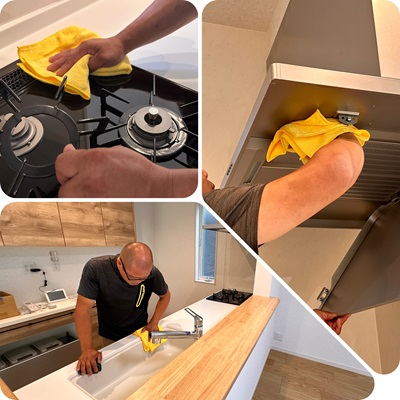 キッチン回り、換気扇などの油汚れ、水アカをキレイに除去します。